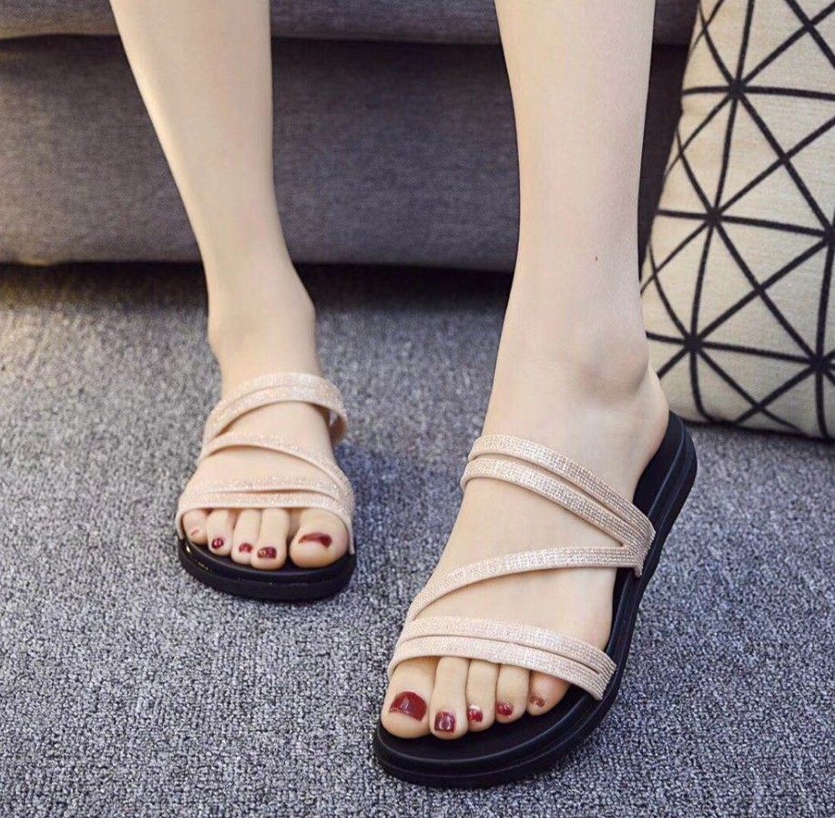 夏新款时尚百搭简约外穿凉拖鞋女防滑耐磨平底一字沙滩鞋小钻家用