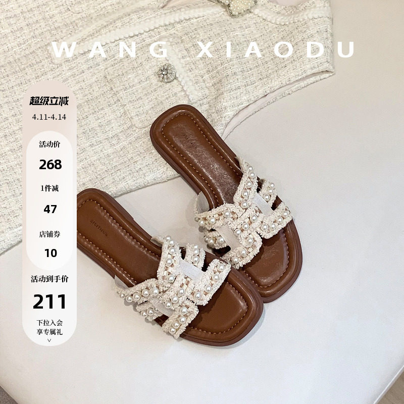 原创【王小毒】小香风H拖●平底一字拖鞋女外穿夏季珍珠流苏拖鞋