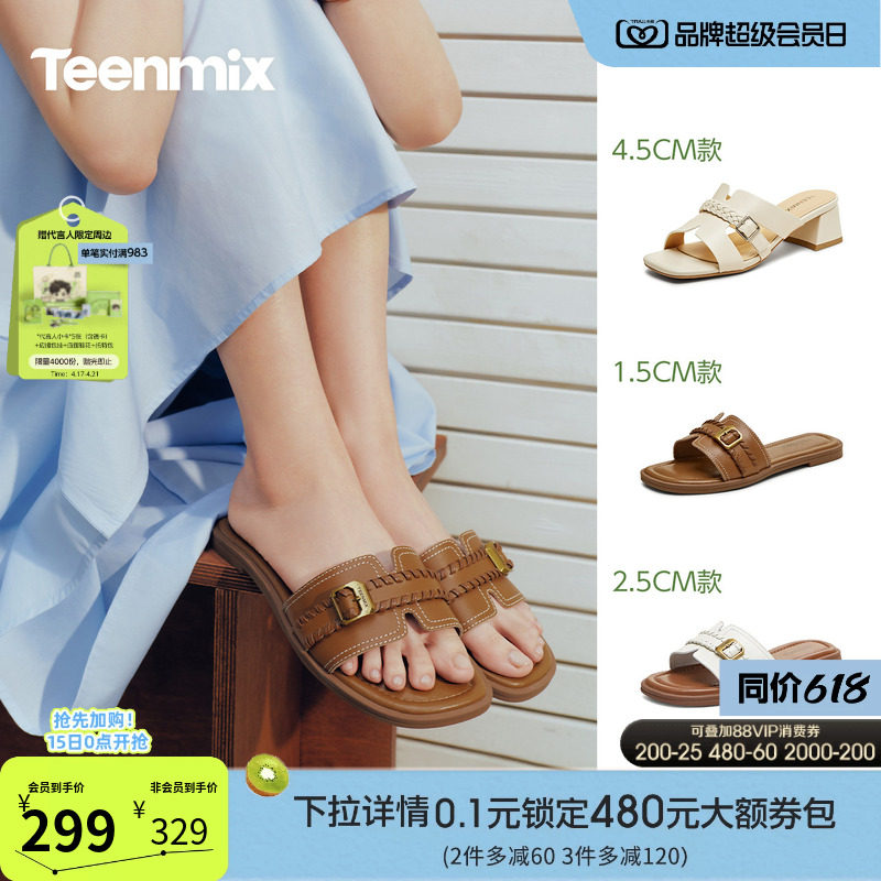 天美意编织假日一字拖法式度假平底拖鞋女外穿休闲凉鞋夏季新款