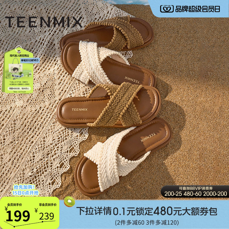 天美意一字拖编织度假平底拖鞋女外穿休闲凉鞋夏季新款KT072BT5