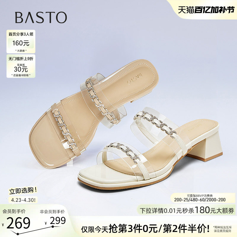 百思图夏季商场新款时尚一字拖凉拖粗跟外穿女拖鞋W3671BT5