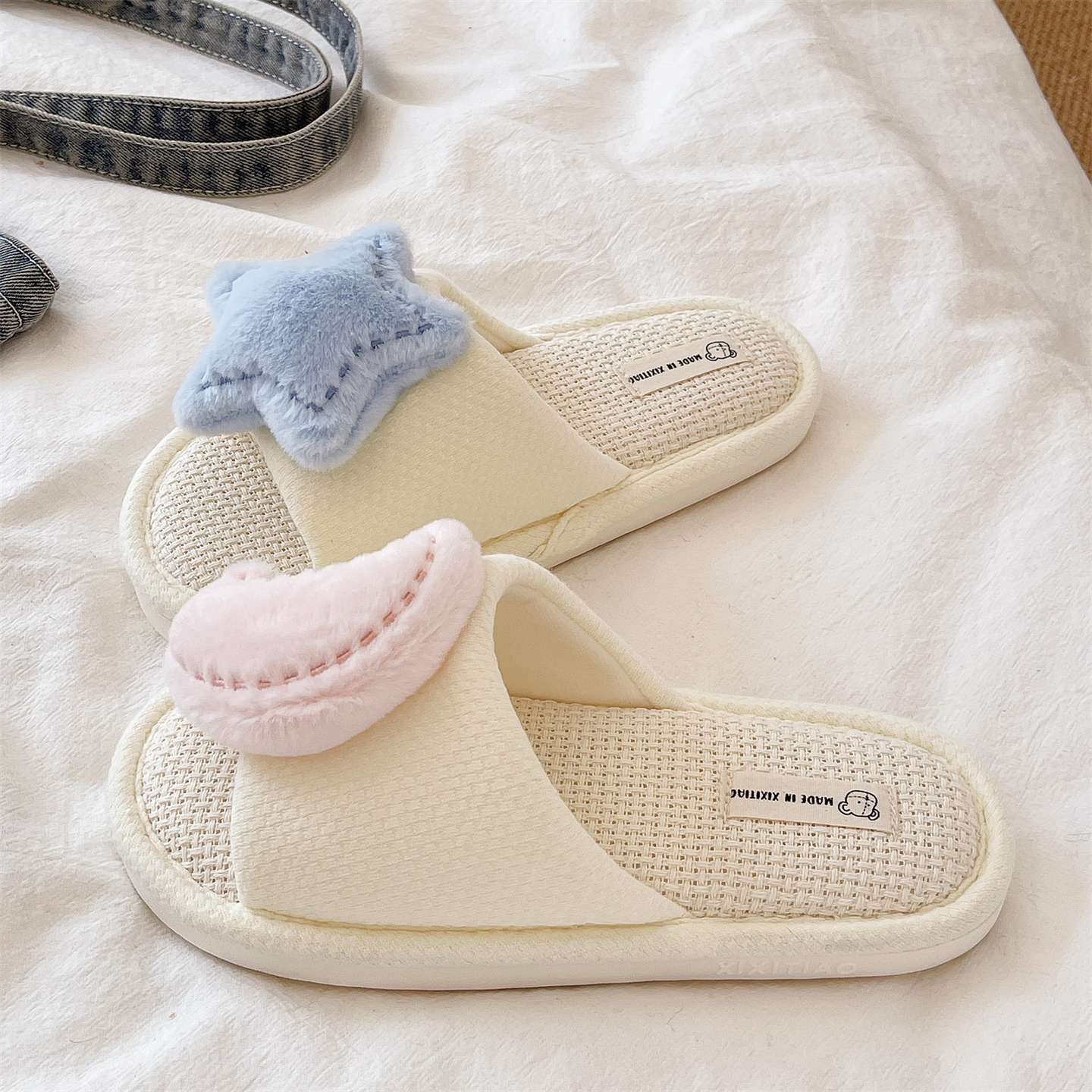 可爱星星月亮亚麻拖鞋女四季通用室内居家防滑软底吸汗地板一字拖