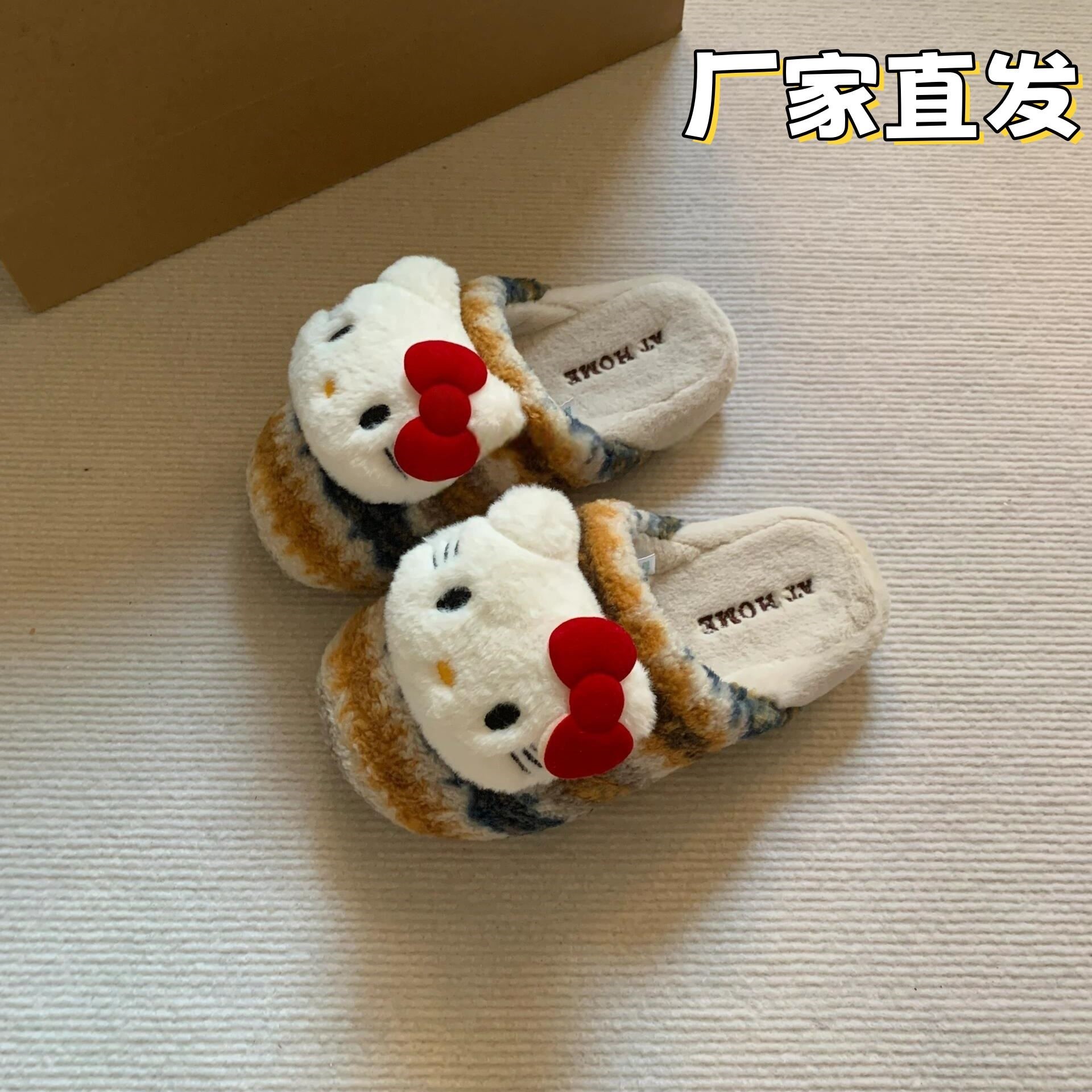 条纹格子kt猫棉拖秋冬保暖休闲鞋懒人居家舒适毛毛拖鞋防滑耐磨