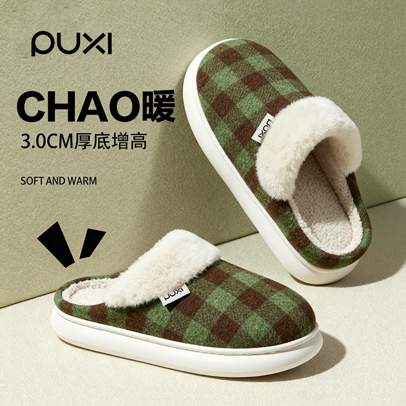 朴西冬季新款方格包头棉拖鞋女厚底加绒保暖室内防滑情侣棉拖女士