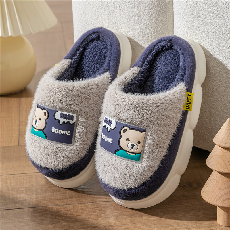 恳虎中大童棉拖鞋秋冬儿童大男孩拖鞋冬天10-12-16岁男童学生毛毛拖鞋 拼接熊标灰色 36 -37码