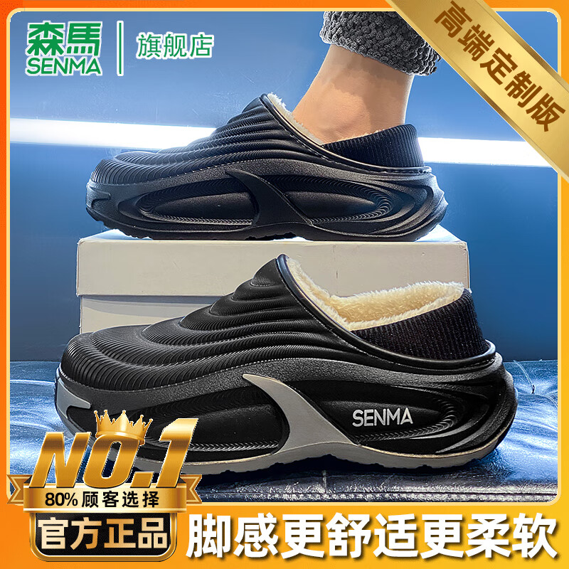 森馬拖鞋男冬季新款加绒加厚保暖抗寒居家棉鞋防水防滑软底时尚包头拖 黑灰【旗舰款】 42-43