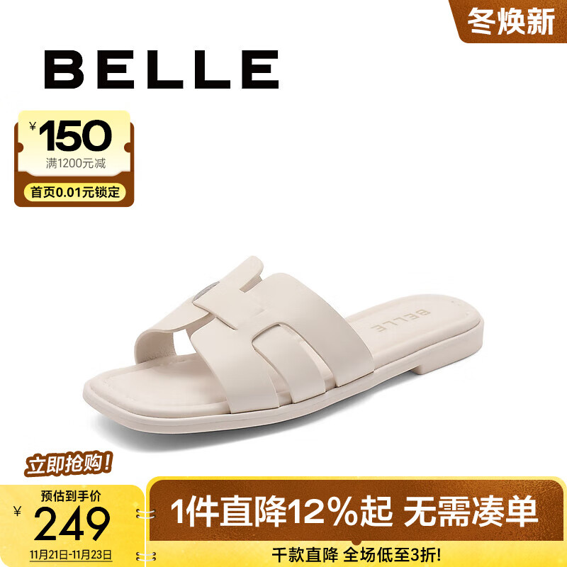 百丽(Belle)编织一字拖女商场款休闲平跟居家拖鞋B3M1DBT4 米白-平跟款 34 (220mm)
