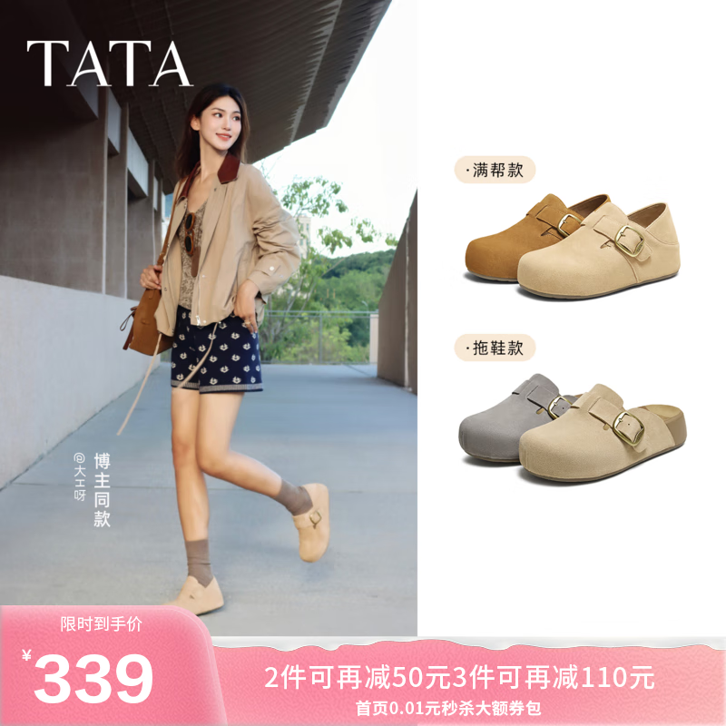 他她(TATA)加绒女鞋2025秋款勃肯鞋外穿包头厚底单鞋休闲鞋拖鞋 杏色 36