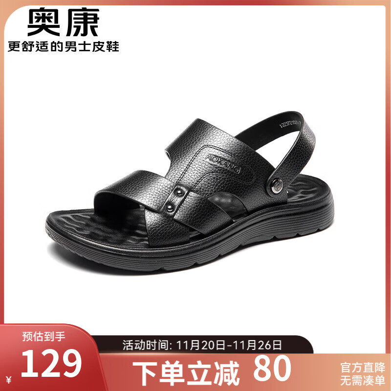 奥康(Aokang)官方男鞋 夏季新款牛皮沙滩两穿凉拖鞋真皮舒适透气男凉鞋 黑色 42 260mm