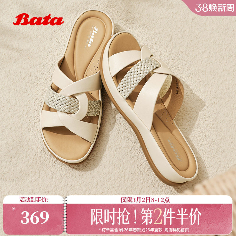 Bata无尽假日新款波西米亚风度假软底编织女凉拖鞋AYX37BT5