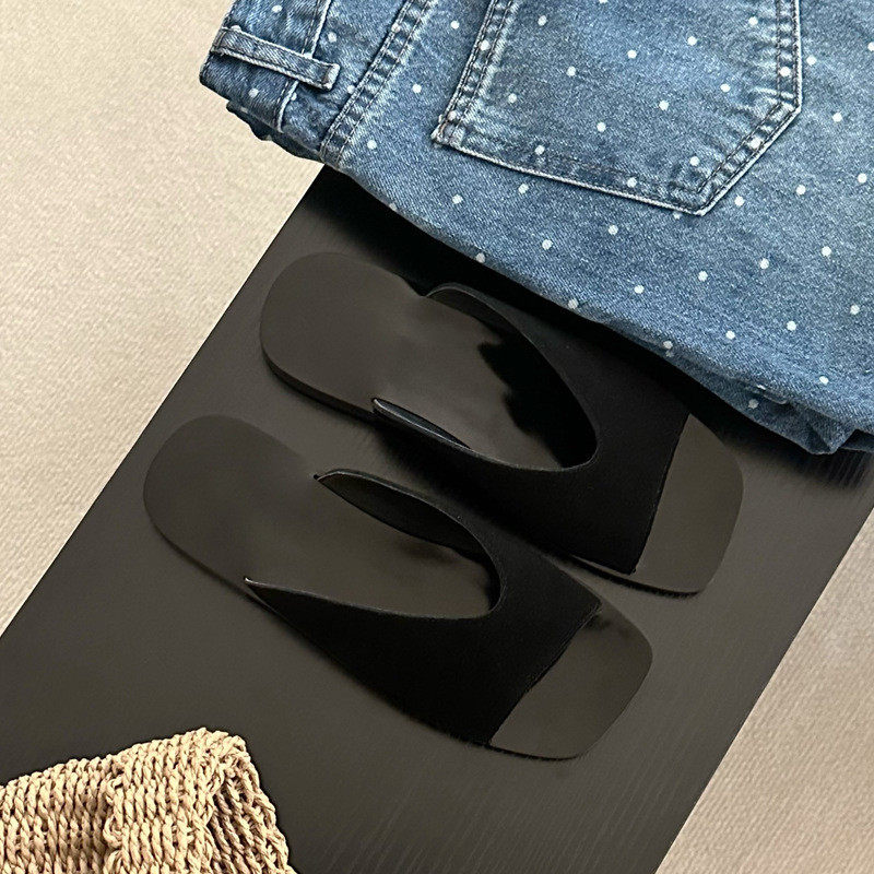韩版简约真皮露脚方头一字平底拖鞋女外穿夏季舒适百搭