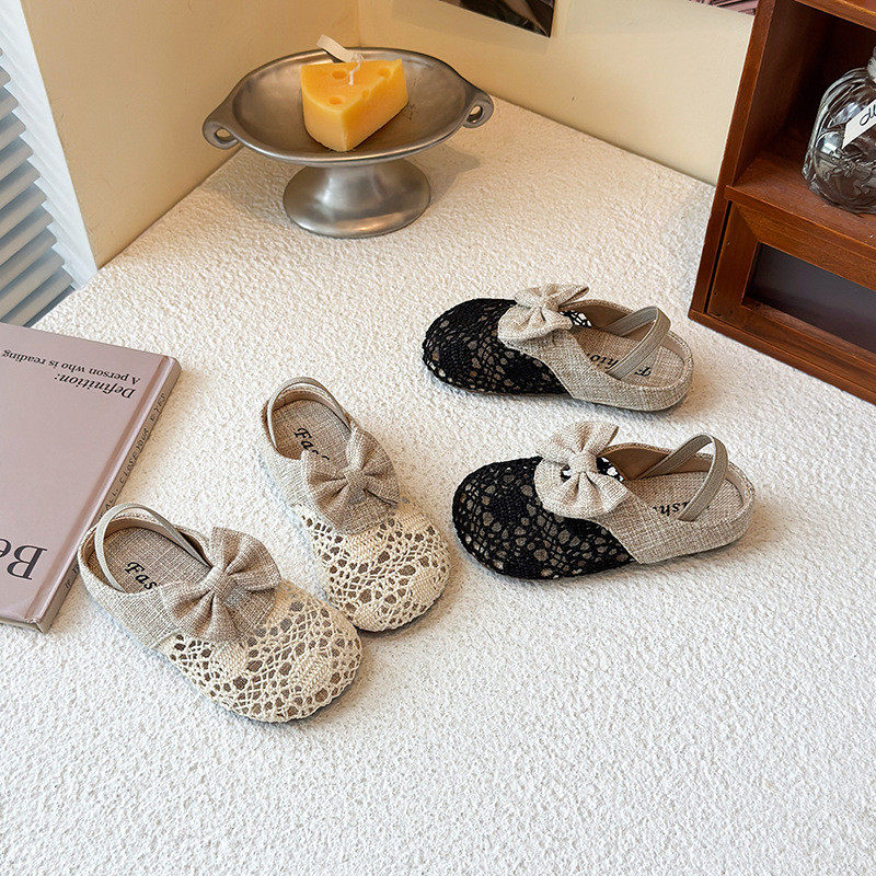 女童夏季网纱镂空蝴蝶结平底外穿包头凉拖鞋甜美透气沙滩风