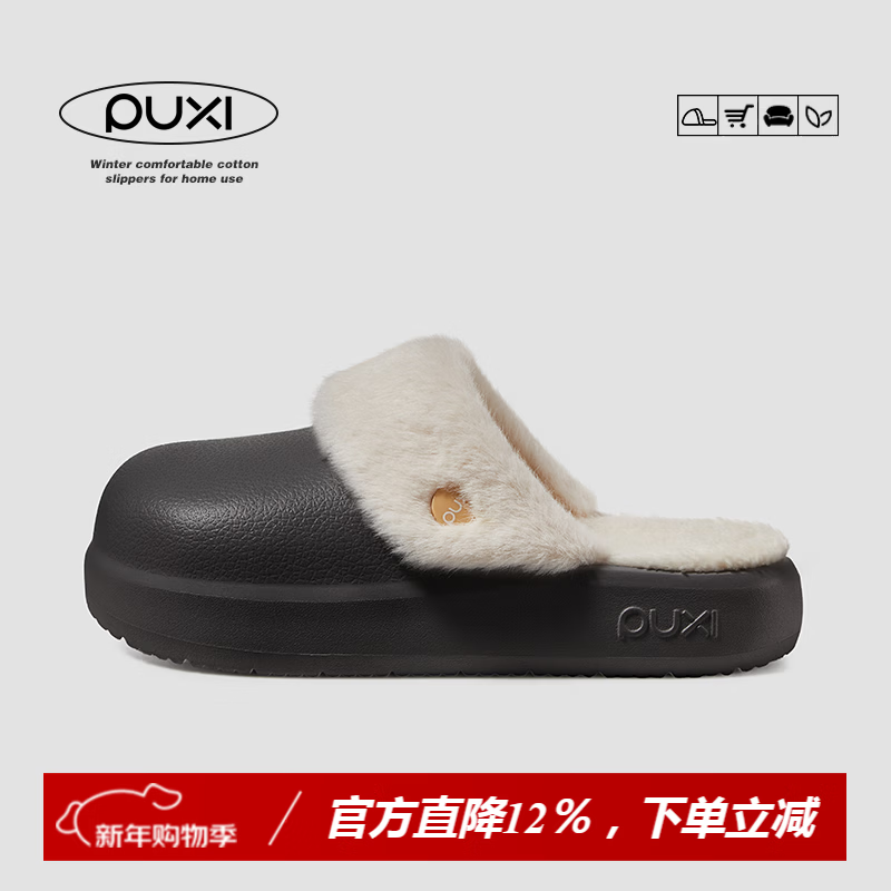 朴西冬季防水棉拖鞋女加绒保暖室内家居可拆卸厚底防滑情侣棉拖男 黑色 【柔软棉绒内胆】 38-39 (适合3738)