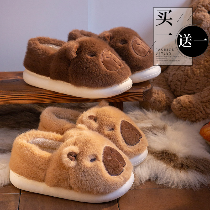 两双装卡皮巴拉棉拖鞋女冬季包跟保暖男士情侣外穿可爱毛绒棉拖鞋