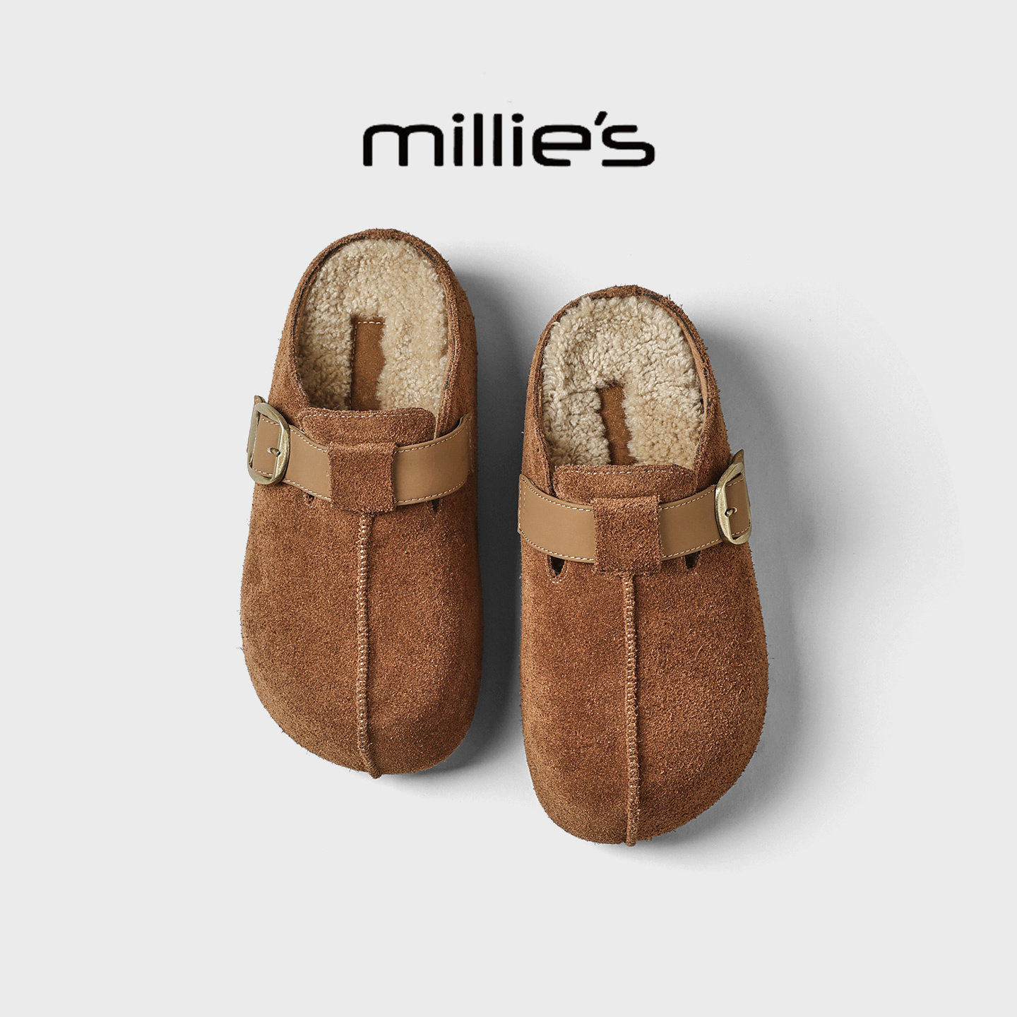 MILLIE'S/妙丽厚底勃肯鞋女包头半拖鞋加绒保暖一脚蹬外穿毛毛鞋