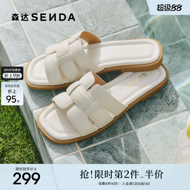 森达一字凉拖鞋女鞋外穿夏季软羊皮海边沙滩度假平底休闲罗马凉鞋