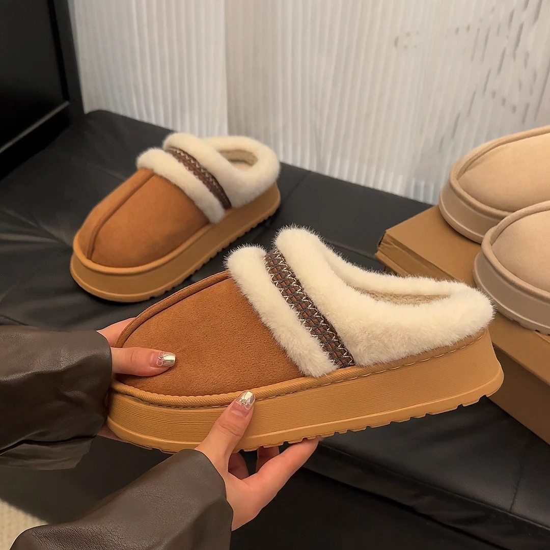 4.5CM加厚加绒情侣冬季厚底防滑毛绒包头美拉德色系居家棉拖鞋户