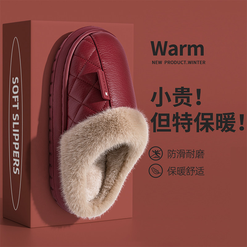 防水棉拖鞋女士秋冬季2024新款室内家居防滑老年人红色皮面拖鞋男