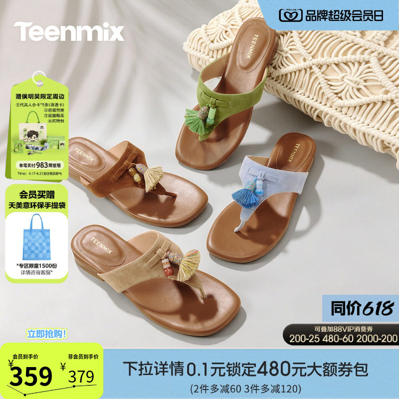 天美意人字拖复古绒面夹趾平底拖鞋女海边度假凉拖鞋2026夏季新款