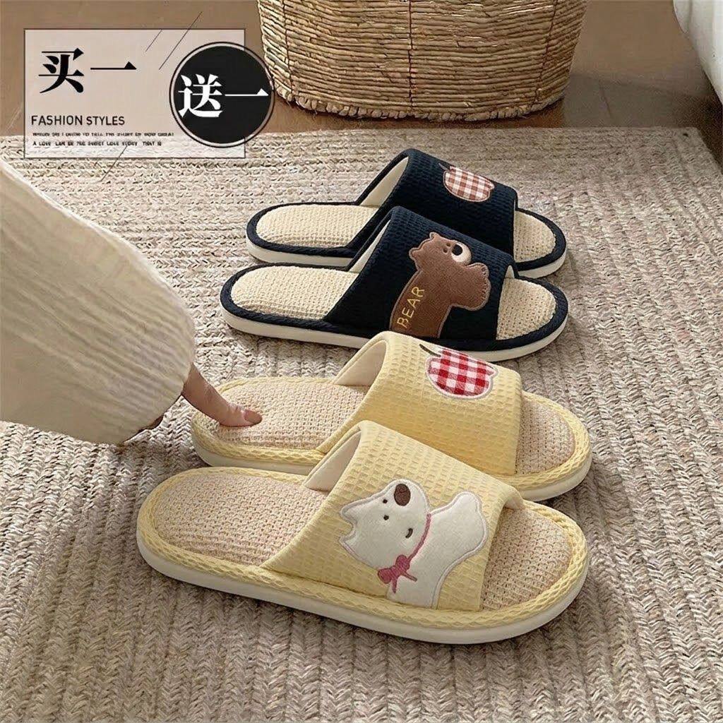 买一送一春秋卡通亚麻拖鞋四季室内家居情侣防滑透气防臭静音棉麻