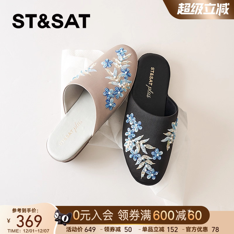星期六低跟一字拖春秋新款气质方头水钻外穿拖鞋女SS32110501