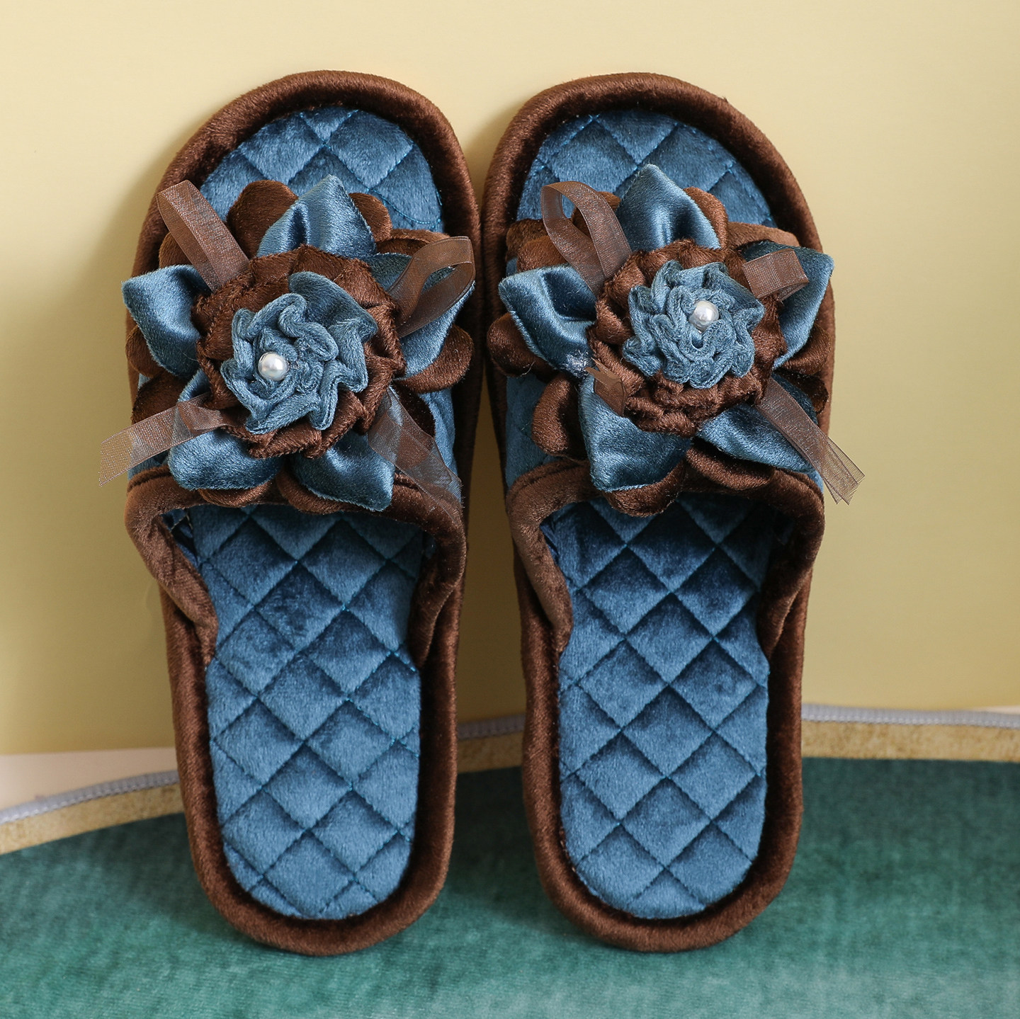 黑色四季绸缎绣花居家室内防水防滑静音软底家居棉拖鞋法式高级女