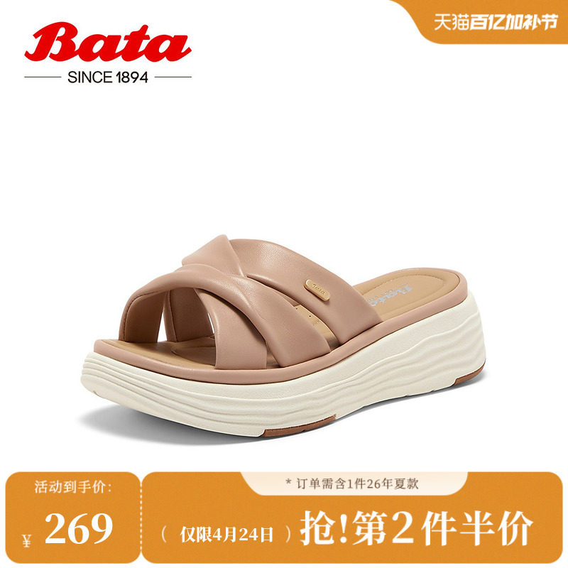 Bata波西米亚编织一字拖女2026夏季新款厚底度假外穿拖鞋86015BT6