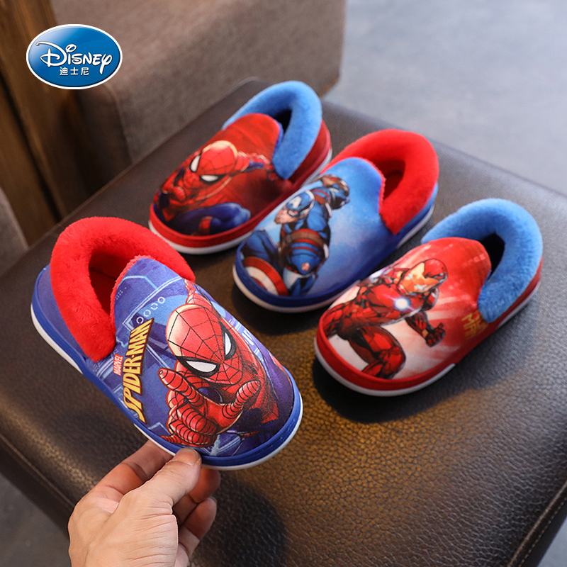 迪士尼儿童棉拖鞋包跟冬2025蜘蛛侠男童室内加绒保暖女孩家居棉鞋