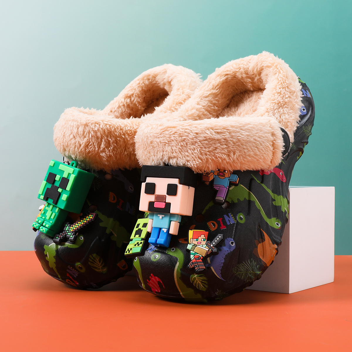 我的世界儿童棉拖鞋包跟冬季毛毛拖鞋大童男孩室内家居鞋保暖新款