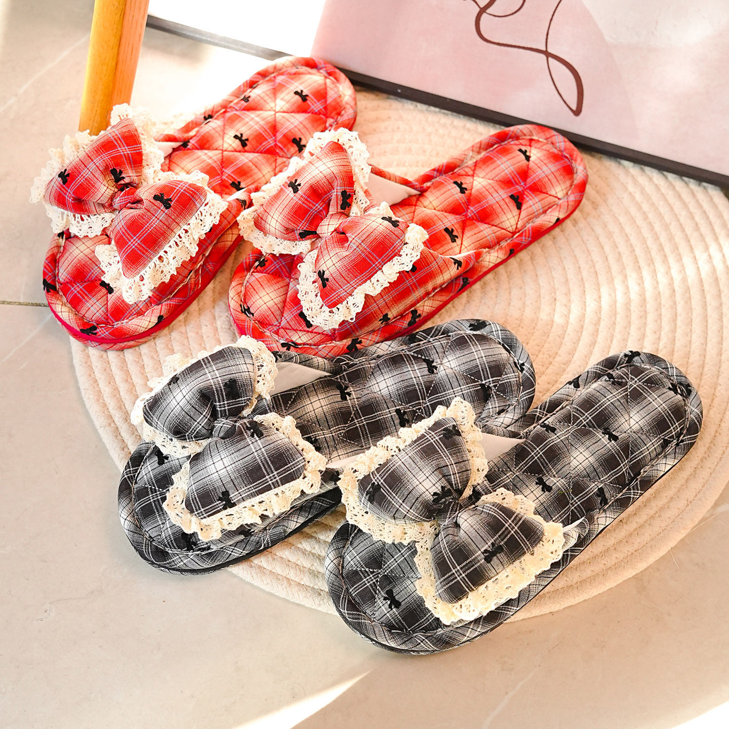 小香风格子布艺布底拖鞋女蝴蝶结软底静音不伤地板居家室内拖鞋