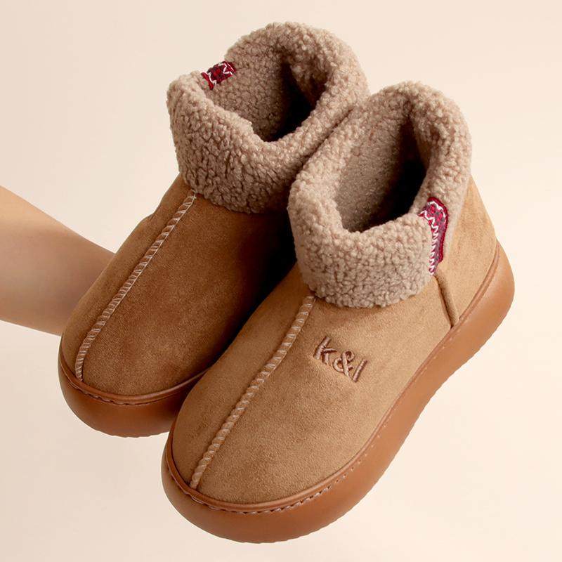 快鹿新款高帮毛绒保暖简约女士包跟棉鞋女式厚底防滑家居棉拖鞋冬