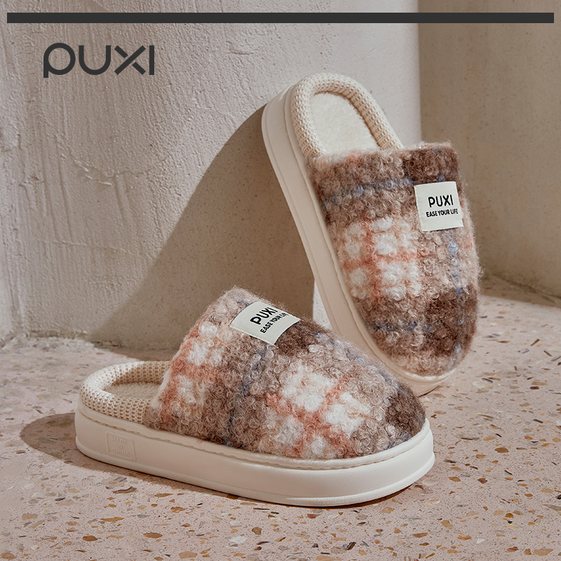 朴西空白格棉拖鞋女冬季家居保暖抗菌复古格纹加绒加厚软底棉拖鞋