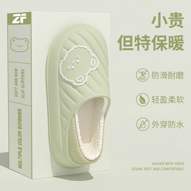 朴西女士可拆卸保暖防水棉拖鞋冬季新款荔枝纹加绒防滑情侣棉拖男