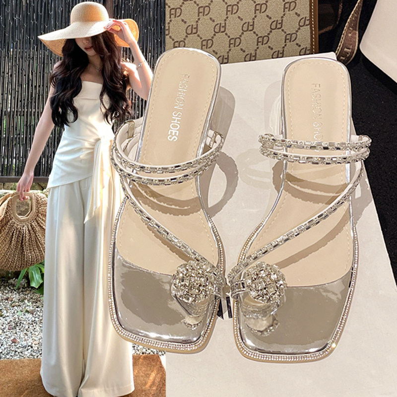 法式粗跟拖鞋女2026年春夏新款鸽子蛋水钻凉拖鞋百搭夹趾两穿凉鞋