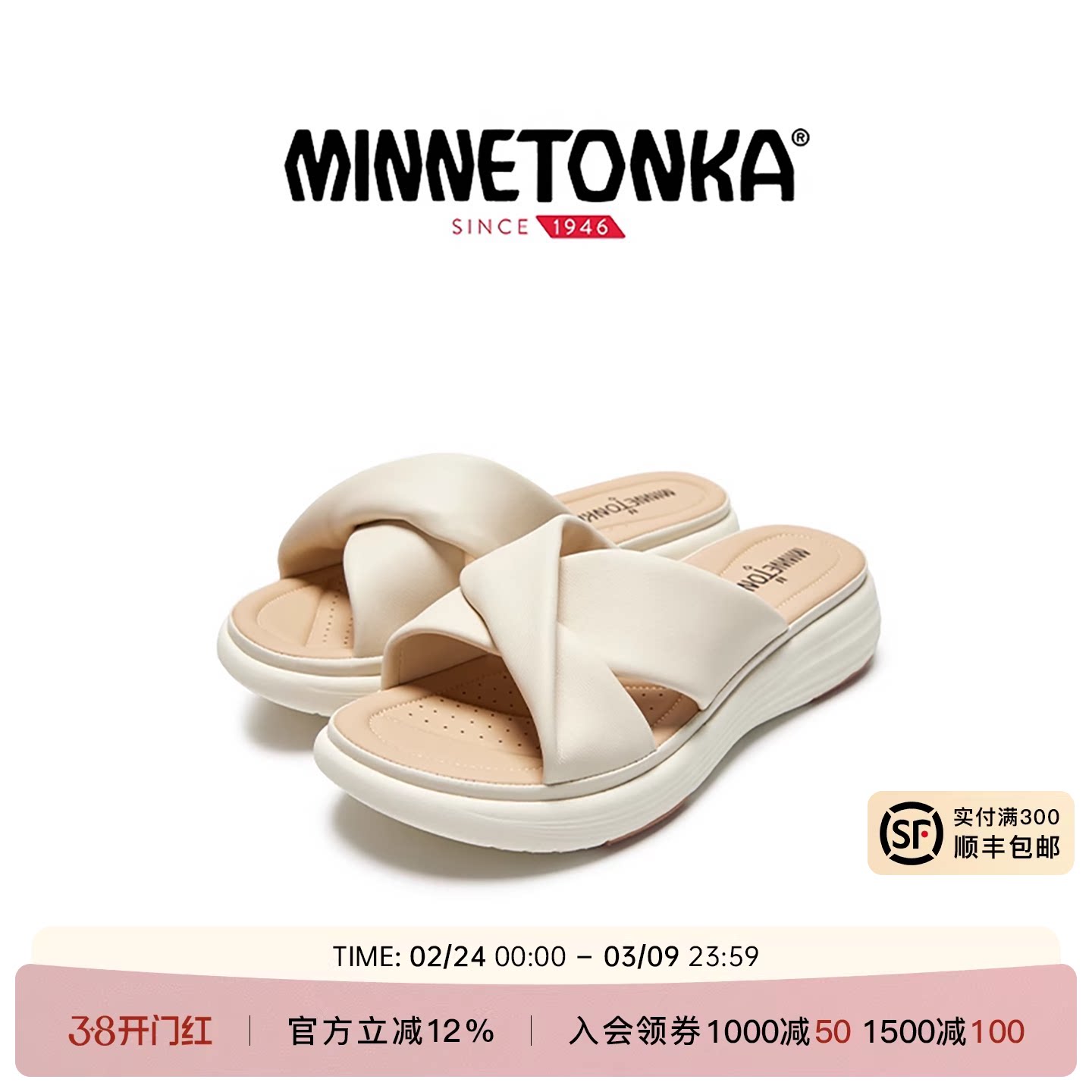 MINNETONKA/迷你唐卡柔软纽带羊皮轻量厚底日常外穿露趾凉拖鞋女