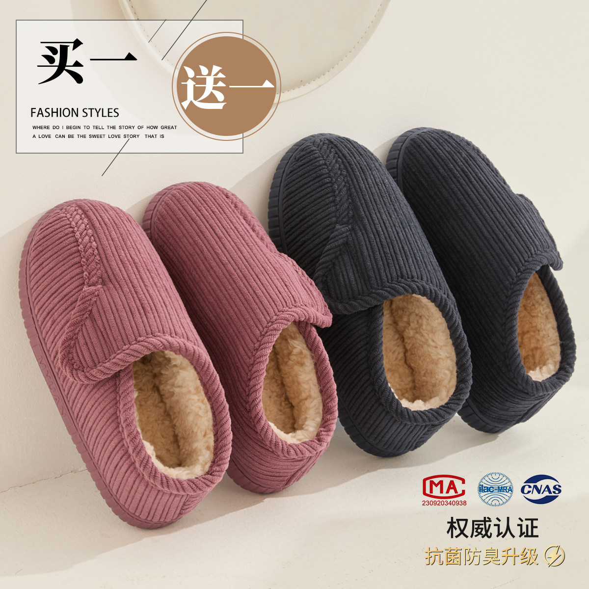 买一送一防水棉拖鞋女秋冬室内家居2024新款乳胶情侣棉拖鞋男冬季