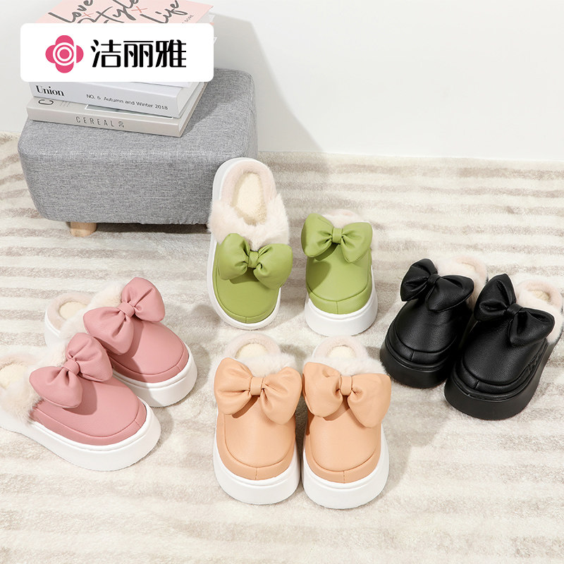 洁丽雅棉拖鞋女蝴蝶结秋冬季居家用加绒保暖防水耐脏可爱休闲棉拖