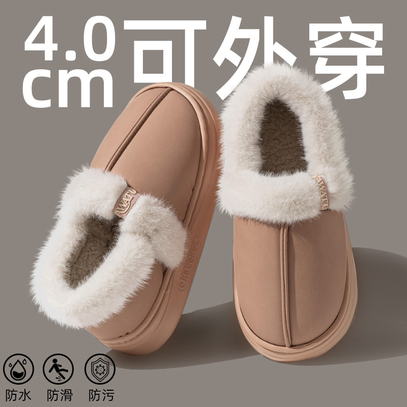 2025冬季新款加绒保暖棉拖鞋女室内居家皮面厚底情侣拖鞋包跟棉鞋