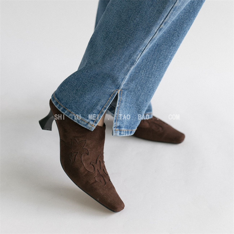 饰与美韩国东大门新款小方头绒面雕花布洛克风细高跟包头外穿拖鞋