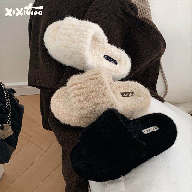细细条 百搭时尚室内外毛毛拖鞋女F防滑厚底纯色秋冬季一字棉拖鞋