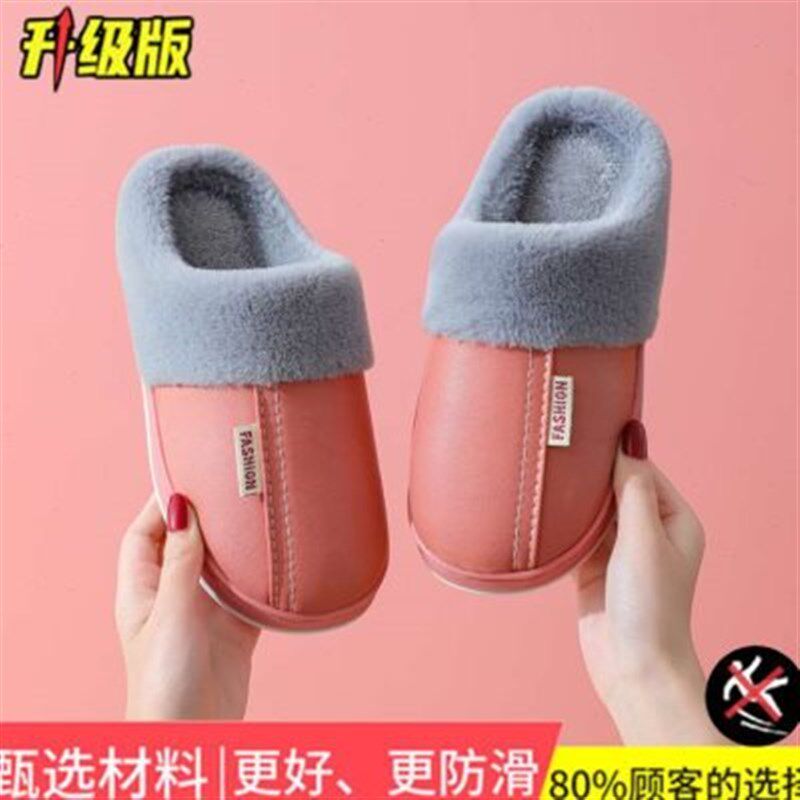 棉拖鞋女防滑老人加绒加厚保暖皮面厚底2024新款冬天红色