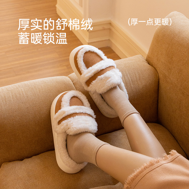 高包跟棉鞋女冬季保暖厚底踩屎感室内家居家用防滑月子毛毛棉拖鞋