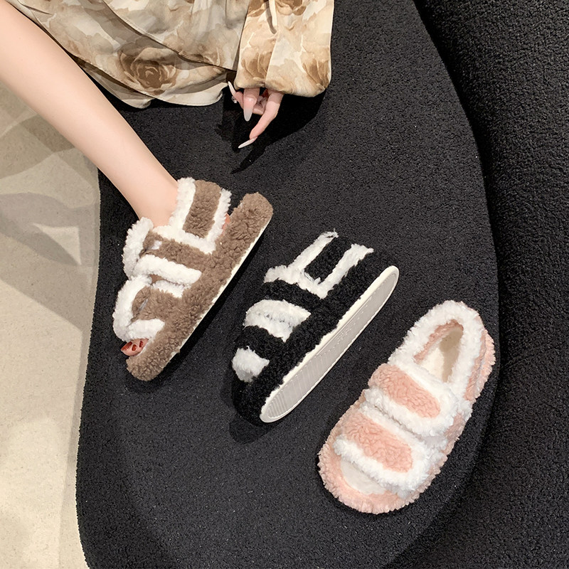 棉拖鞋女家居防滑秋冬季保暖室内可爱外穿厚底毛球新款坡跟PU皮面