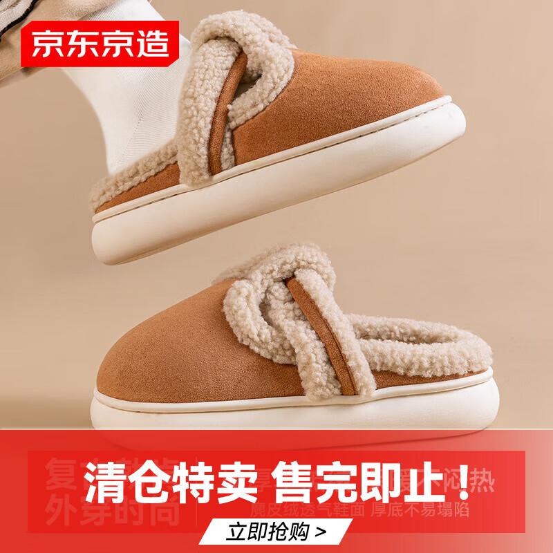 京东京造时尚毛绒厚底棉拖鞋软弹冬季保暖居家室内卡其色38-39