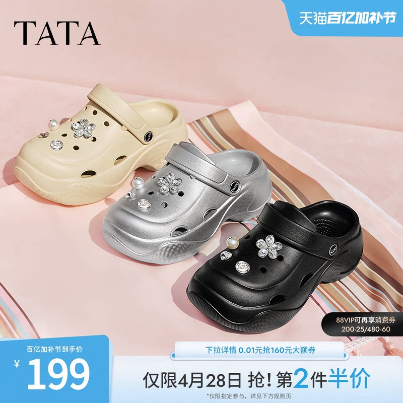 TATA他她黑色包头拖鞋女通勤厚底洞洞鞋女外穿半拖凉鞋夏7H801BH5