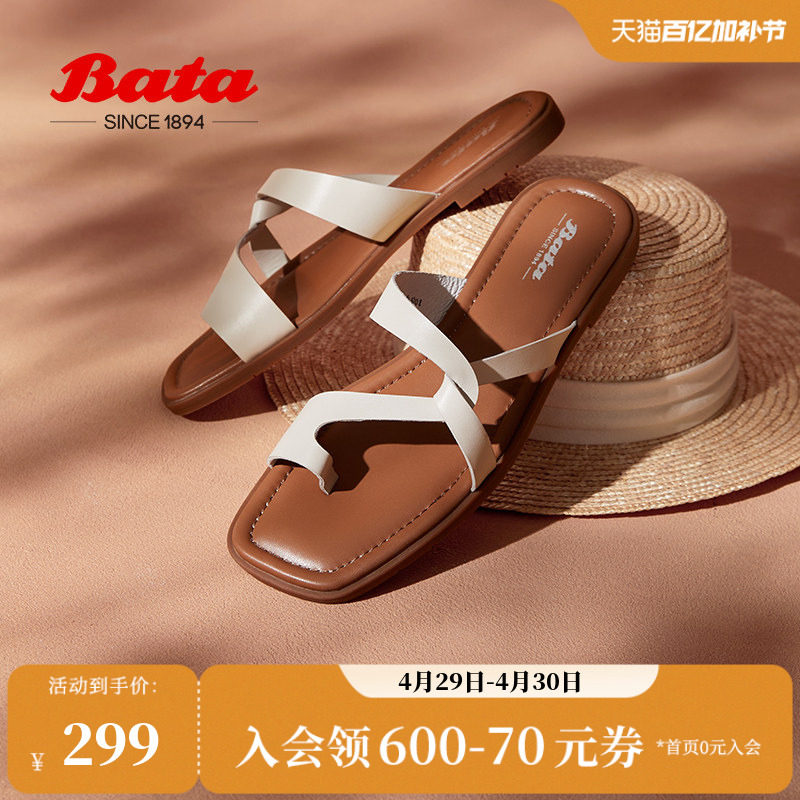Bata罗马假日拖鞋女夏季新款牛皮软底外穿夹趾凉拖ARP23BT4