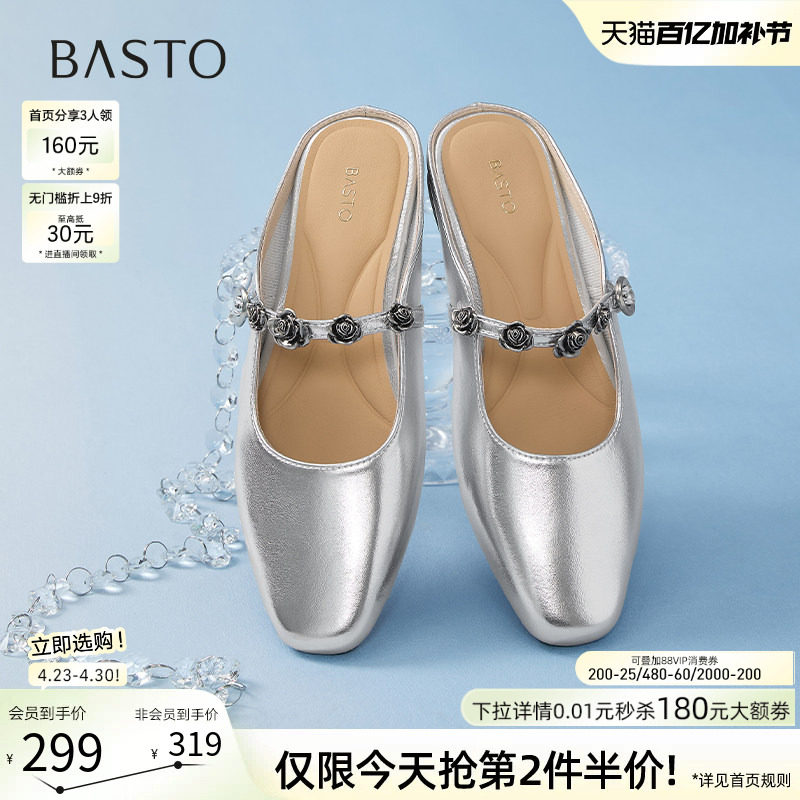 百思图夏新款红玫瑰穆勒鞋半拖懒人一脚蹬外穿女凉拖鞋F2171BH5