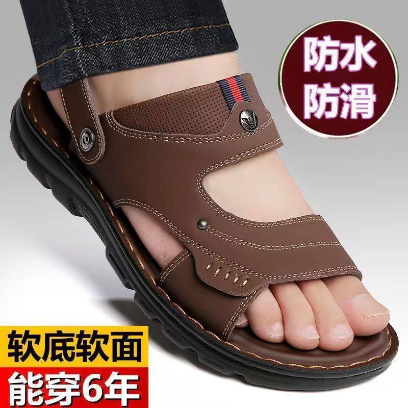 老人头凉鞋男士夏季牛皮休闲沙滩鞋真皮软底防滑中老年爸爸拖鞋男