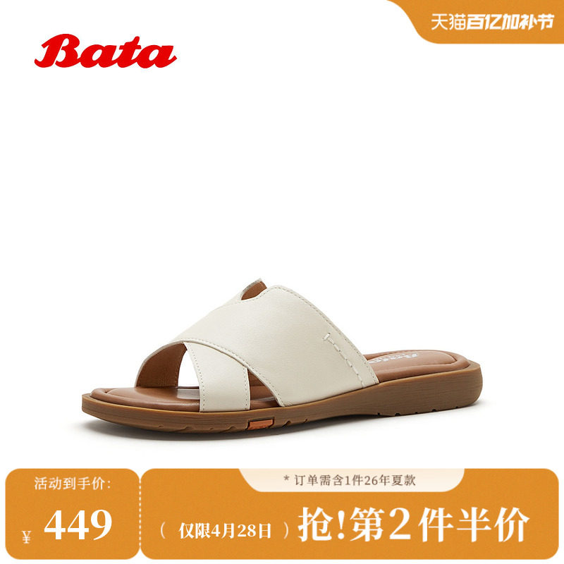 Bata一字拖女2026夏季新款日常居家外穿舒适羊皮软底拖鞋AYJ17BT6