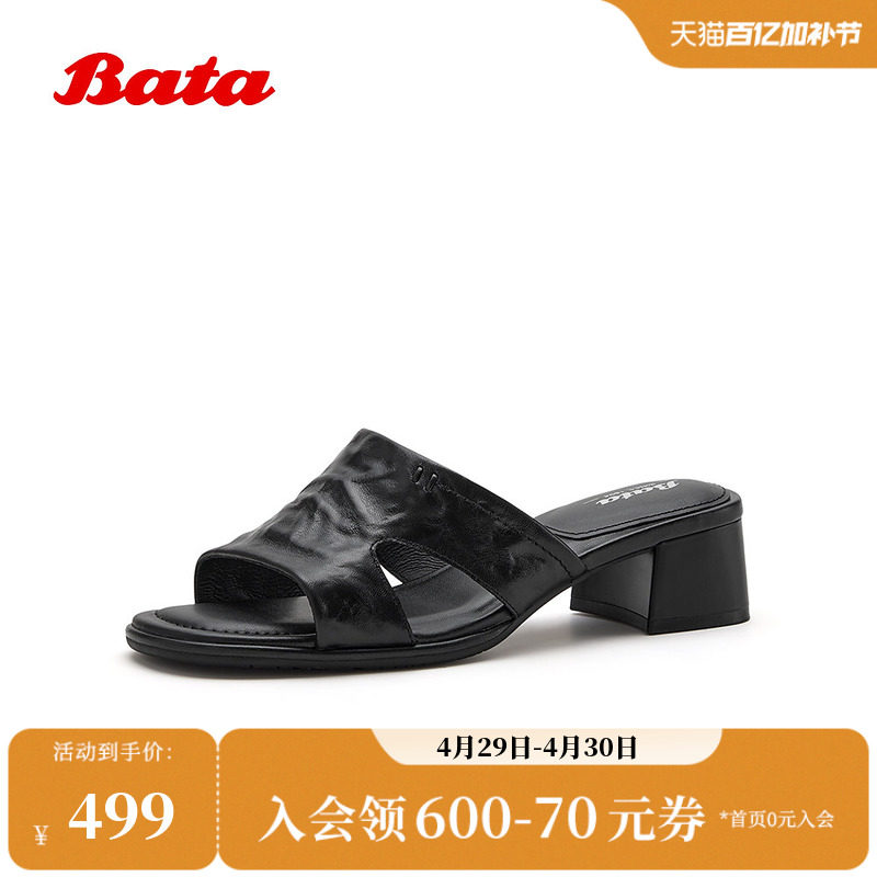 Bata一字拖女2026夏商场新款优雅风外穿粗跟抓纹羊皮拖鞋AVR28BT6